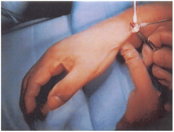 FIGURE 14-11. Traction on the decompressed extensor pollicis brevis tendon.