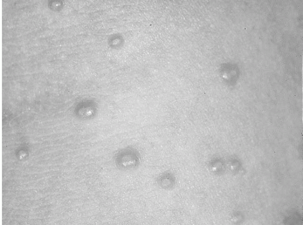 The skin under the vesicles tends to be erythematous but this does not extend far beyond the lesions.