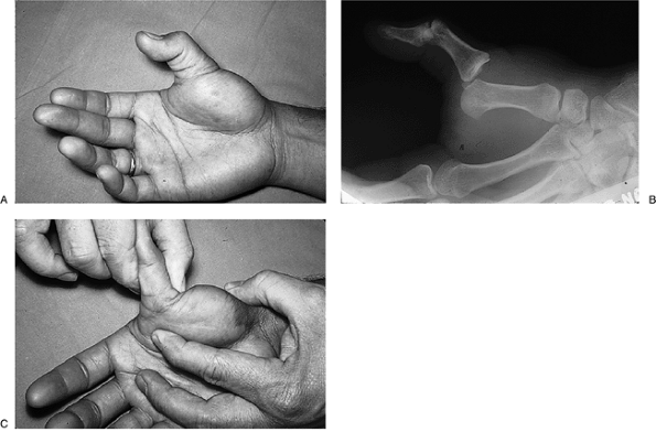 Figure 10-21 shows the clinical and x-ray appearance of a dislocation of the thumb CMC joint.