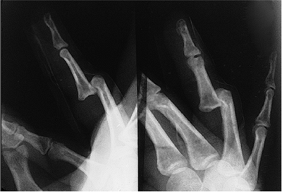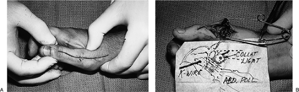 Figure 10-1 (A) X-ray appearance of a dorsal dislocation of the IP joint of the thumb. (B) X-ray appearance after reduction and splinting.