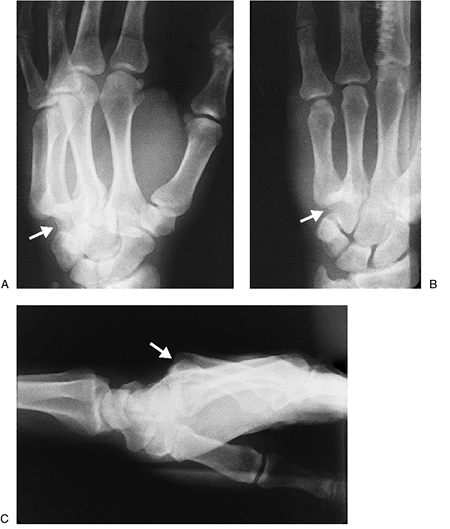 Figure 10-20 X-ray appearance in three views of a dorsal dislocation of the CMC joint of the ring and little fingers (arrows). Note that the dislocation is most apparent in the oblique and lateral views.P.157