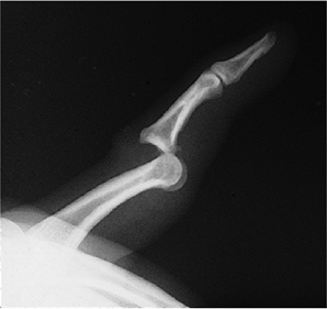 Figure 10-4 X-ray appearance of a dorsal PIP joint dislocation. -
