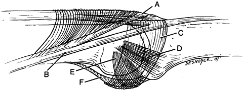Basic anatomy of the proximal interphalangeal joint. A, central extensor slip; B, intrinsic lateral band; C, transverse retinacular ligament; D, dorsal cord portion collateral ligament; E, accessory collateral ligament; F, volar plate. (From Vicar AJ. Proximal Interphalangeal Joint Dislocations without a Fracture. Hand Clin 1988;4:5, with permission.) |