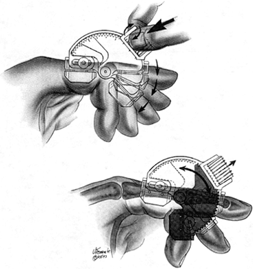 which is narrower dorsally than volarly in the sagittal plane and has a proportionately larger AP diameter than that of the phalangeal head (bottom). (From Green DP, Butler TE. Fractures and Dislocations in the Hand. In: Rockwood CA, Green DP, Bucholz RW, Heckman JD, eds. Fractures in Adults, 4th ed. Philadelphia: Lippincott-Raven, 1996:677, with permission.) |