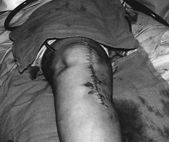 Figure 91.5. A: Anteroposterior radiograph of a posterolateral dislocation with marginal patellar fracture. B: Lateral radiograph of a posterolateral dislocation. C: Appearance of knee before reduction. D: Medial femoral condyle buttonholed through medial capsule, blocking closed reduction.