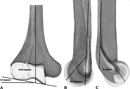 • The trochlear axis compared with the longitudinal axis is 4 to 8 degrees of valgus.