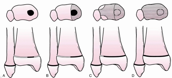 FIGURE 26-1 Salter-Harris anatomic classification as applied to injuries of the distal tibial epiphysis.