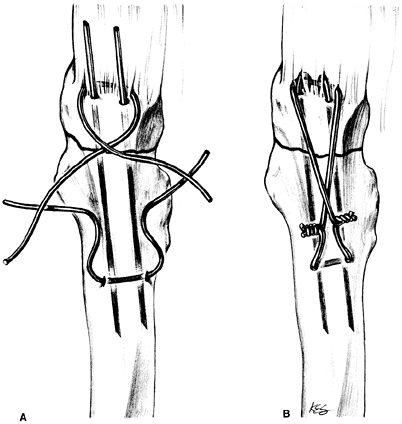 Posterior approach, ORIF with tension band wire loop (figure-8) around