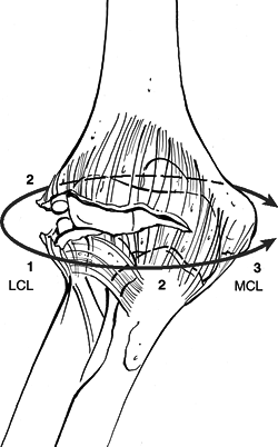 of the MCL remaining intact. There is a variable degree of injury to the common flexor and extensor musculature (Fig. 18.2).