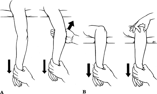 18.6. (A) Parvin’s method of closed reduction of an elbow dislocation. The patient lies prone on a stretcher, and the physician applies gentle downward traction of the wrist for a few minutes. As the olecranon begins to slip distally, the physician lifts up gently on the arm. No assistant is required, and if the maneuver is done gently, no anesthesia is required. (B) In Meyn and Quigley’s method of reduction, only the forearm hangs from the side of the stretcher. As gentle downward traction is applied on the wrist, the physician guides reduction of the olecranon with the opposite hand. (A, redrawn from Parvin RW. Closed reduction of common shoulder and elbow dislocations without anesthesia. Arch Surg