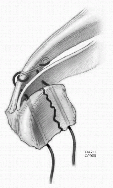 The ulnar nerve must be meticulously protected during placement of the inferior drill hole.