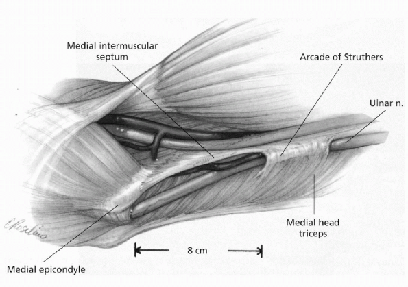 After the arthroscopic portion of the procedure is finished, a medial approach to the elbow is used.P.319