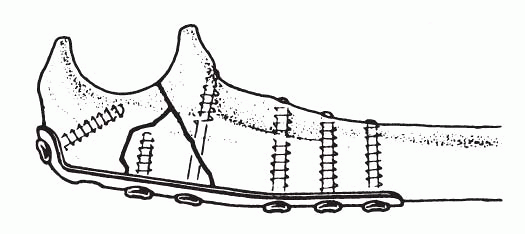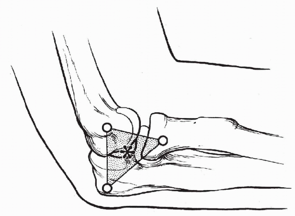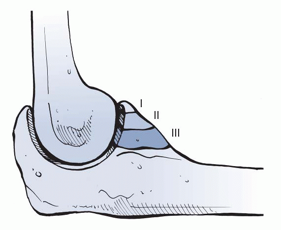 The approach for this and most other olecranon fractures is posterior, with the incision slightly lateral to the olecranon.