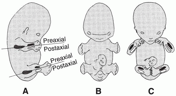 Development of the bones in the free limbs in relation to the limb axis. The bone primordium of the proximal segment is dark gray, the preaxial bone of the intermediate segment is black, and the postaxial bone is white. (B and C) Successive stages of limb development from a ventral view before the limbs undergo rotation. The position of the preaxial and postaxial bone in the upper and lower limbs is still symmetric. (From Rosse C, Gaddum-Rosse P. Basic structural plan of the limbs. In: Hollinshead’s textbook of anatomy, 5th ed. Philadelphia: Lippincott-Raven, 1997:183.) |