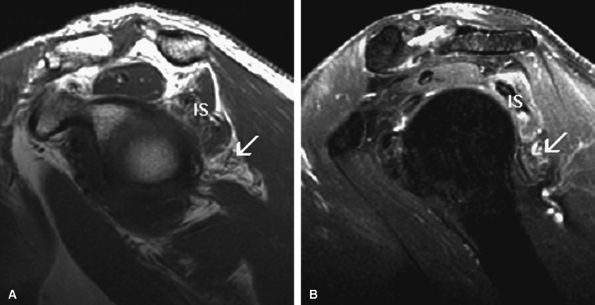 FIGURE 12.11 ● Parsonage-Turner syndrome. Oblique sagittal T1-weighted (A) and fat-suppressed T2-weighted (B) images show denervation edema and atrophy of the infraspinatus (IS) and teres minor (arrow) muscles.