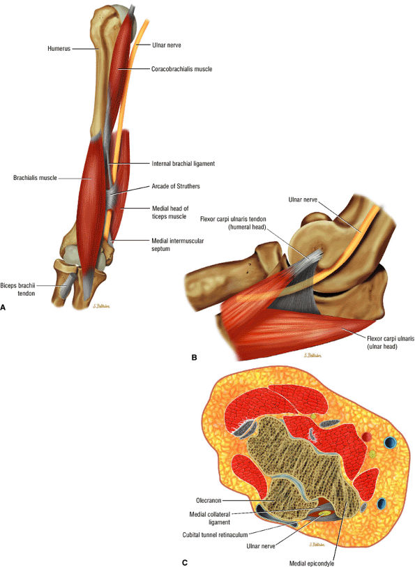 FIGURE 12.12 ● The ulnar nerve: anterior (A), medial (B), and axial (C) views. In the distal arm the ulnar nerve descends within the arcade of Struthers, then runs posterior to the medial epicondyle and deep to the cubital tunnel retinaculum and arcuate ligament within the cubital tunnel before entering the forearm between the two heads of the flexor carpi ulnaris muscle.