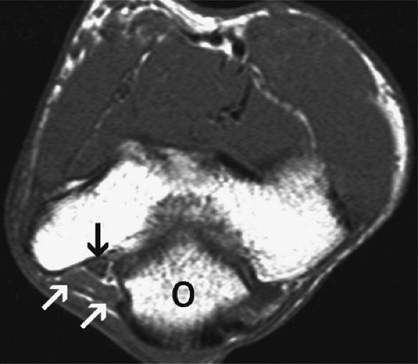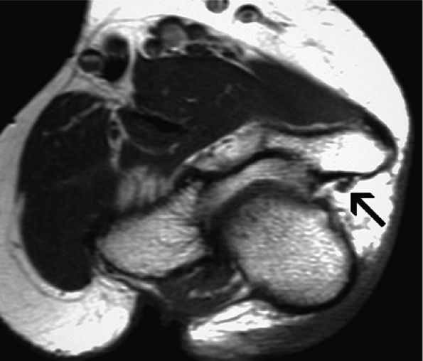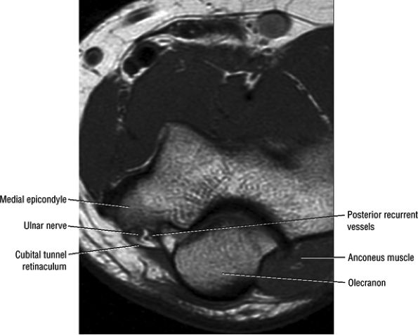 FIGURE 12.25 ● Absent arcuate ligament. Axial T1-weighted image demonstrates absence of the arcuate ligament incidentally noted in this asymptomatic patient. The ulnar nerve is normal (arrow).