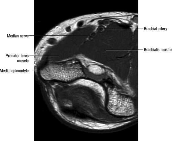 FIGURE 12.16 ● Normal MR anatomy of the median nerve. Axial PD-weighted image demonstrates the median nerve between the pronator and the brachialis muscles.
