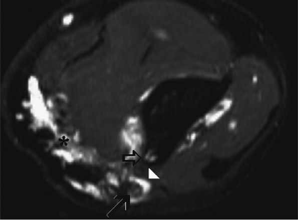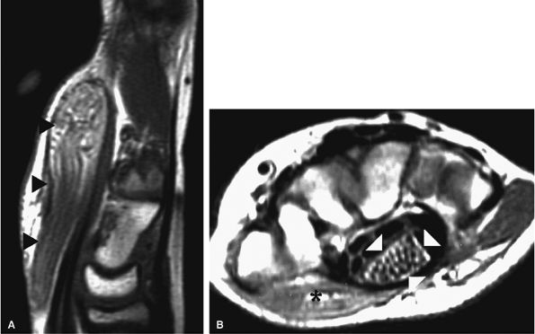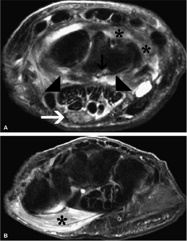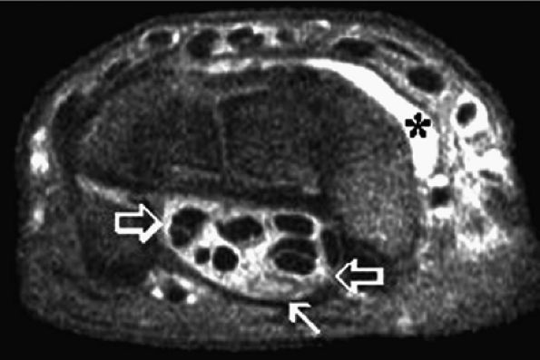 FIGURE 12.42 ● Carpal tunnel syndrome and flexor tenosynovitis. Axial fat-suppressed T2-weighted image demonstrates marked peritendinous inflammatory edema of the flexor tendons within the carpal tunnel consistent with tenosynovitis (open arrows). Note flattening and edema of the median nerve (arrow) and associated synovitis in this patient with rheumatoid arthritis (asterisk).