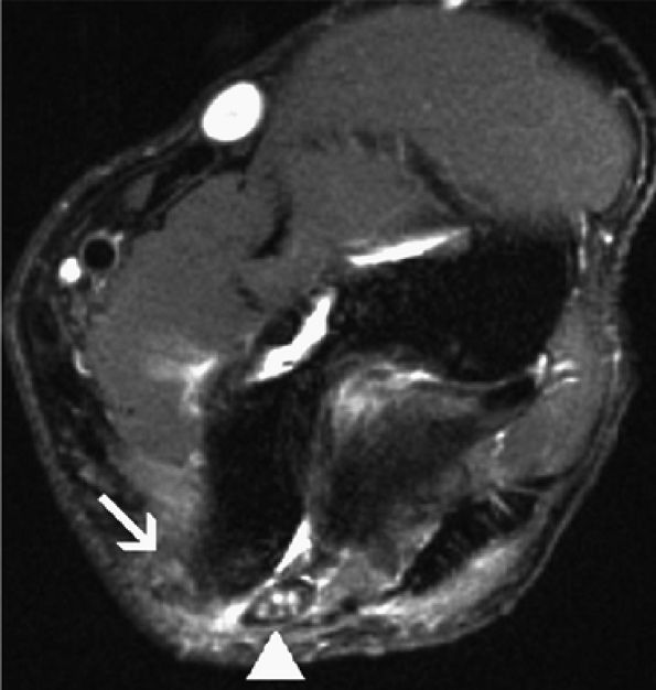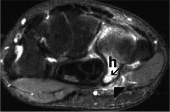 FIGURE 12.47 ● Ulnar neuropathy secondary to fracture of the hook of the hamate. Axial fat-suppressed T2-weighted image demonstrates a non-displaced fracture (arrow) of the hook of the hamate (h) associated with edema within Guyon's canal (arrowhead).