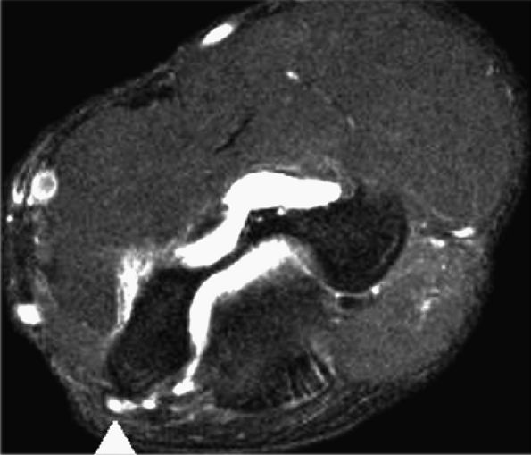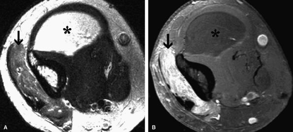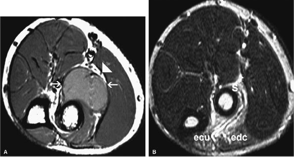 Ganglion cysts, soft-tissue tumors (see Fig. 12.19), degenerative spurs, and anomalous muscles such as the anconeus epitrochlearis (see Fig. 12.21) may be responsible for compressive ulnar neuropathy and can be easily depicted on MR images.