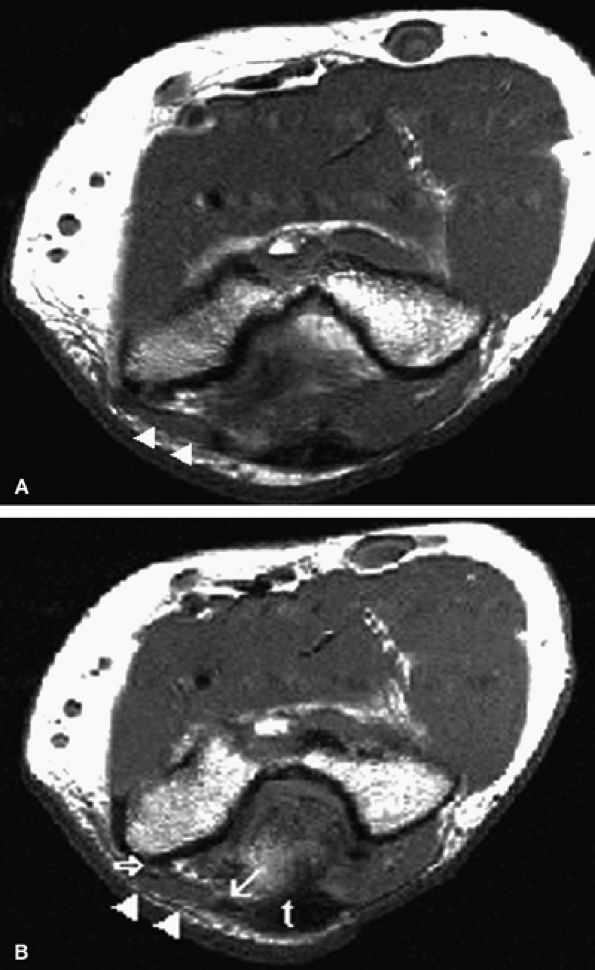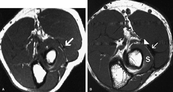 FIGURE 12.33 ● Free edge of the thickened extensor carpi radialis brevis. (A) Axial T1-weighted image depicts a low-signal free edge of the extensor carpi radialis brevis in an asymptomatic individual. (B) The thickened free edge (arrow) is shown in close proximity to the posterior interosseous nerve (arrowhead) in a patient with radial tunnel syndrome. Associated mild fatty infiltration of the supinator muscle (S) is noted.