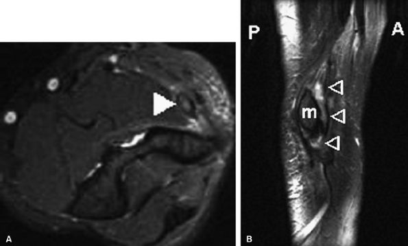 FIGURE 12.27 ● Failed anterior ulnar nerve transposition. Axial post-contrast fat-suppressed T1-weighted image (A) and oblique sagittal fat-suppressed T2-weighted image (B) demonstrate increased signal and thickening of the transferred ulnar nerve (arrowheads). m, medial epicondyle.