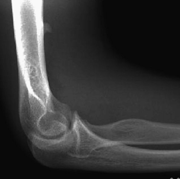FIGURE 12.29 ● Supracondylar process. Lateral radiograph of the elbow depicts osseous excrescence arising from the anterior aspect of the distal humerus and pointing toward the elbow joint.