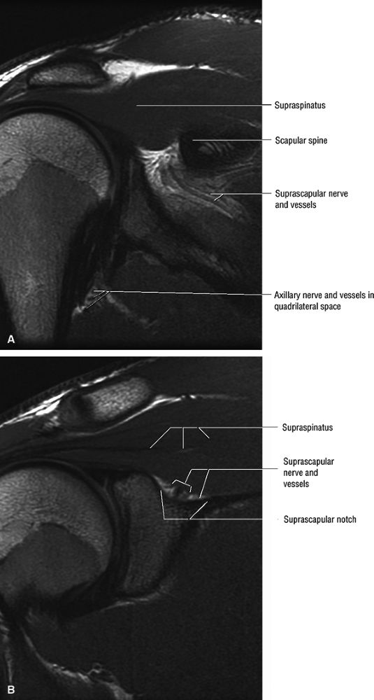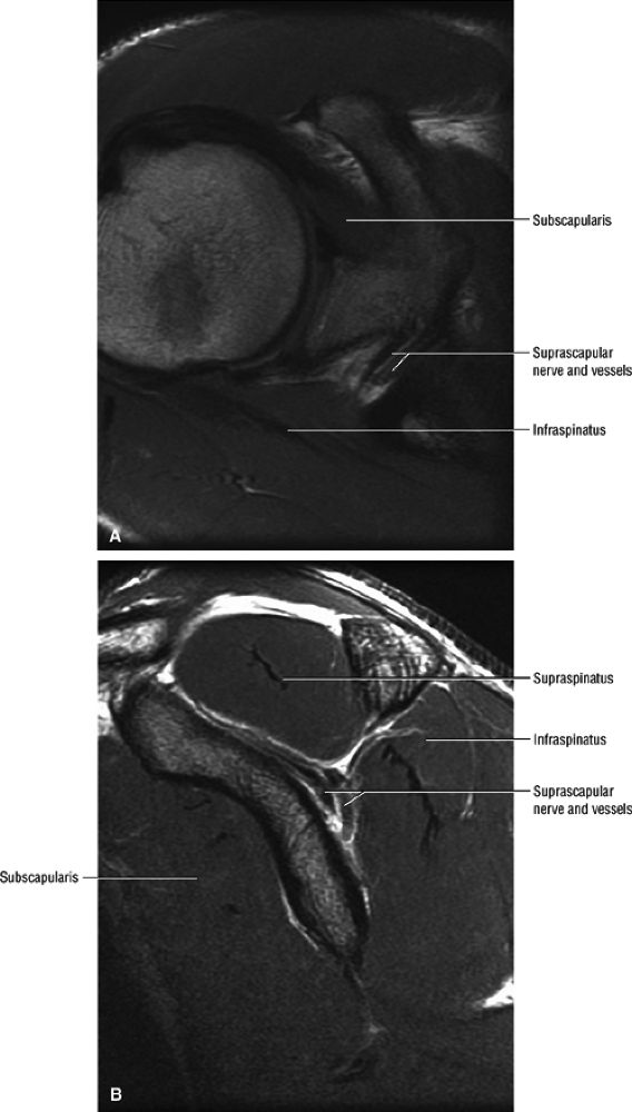 FIGURE 12.4 ● Normal MR anatomy of the suprascapular nerve. (A) Axial PD-weighted image demonstrates the supra-scapular nerve as a linear, intermediate-signal structure at the level of the suprascapular incisura. (B) Sagittal PD-weighed image at the level of the spinoglenoid notch demonstrates the supra-scapular nerve and vessels.