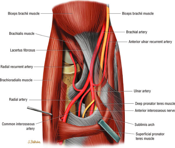 (lacertus fibrosus) and the brachialis muscle, traveling deep to the pronator teres as it courses into the forearm (Fig. 12.16). In the elbow region, the median nerve supplies all the superficial muscles of the ventral forearm (the pronator teres, the flexor carpi radialis, the palmaris longus, and the flexor digitorum superficialis) except the flexor carpi ulnaris muscle.