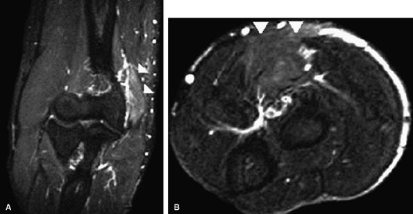 FIGURE 12.31 ● Pronator syndrome. Oblique coronal (A) and axial (B) fat-suppressed T2-weighted images show diffuse denervation edema of the pronator teres muscle (arrowheads).