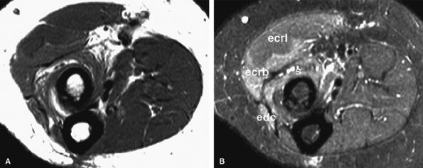 FIGURE 12.35 ● Posterior interosseous nerve syndrome. Axial T1-weighted (A) and fat-suppressed T2-weighted (B) images at the proximal forearm show atrophy and edema of the supinator and extensor musculature. The extensor carpi radialis longus, which is not innervated by the posterior interosseous nerve, is not involved. s, supinator; edc, extensor digitorum communis; ecrb, extensor carpi radialis brevis; ecrl, extensor carpi radialis longus.