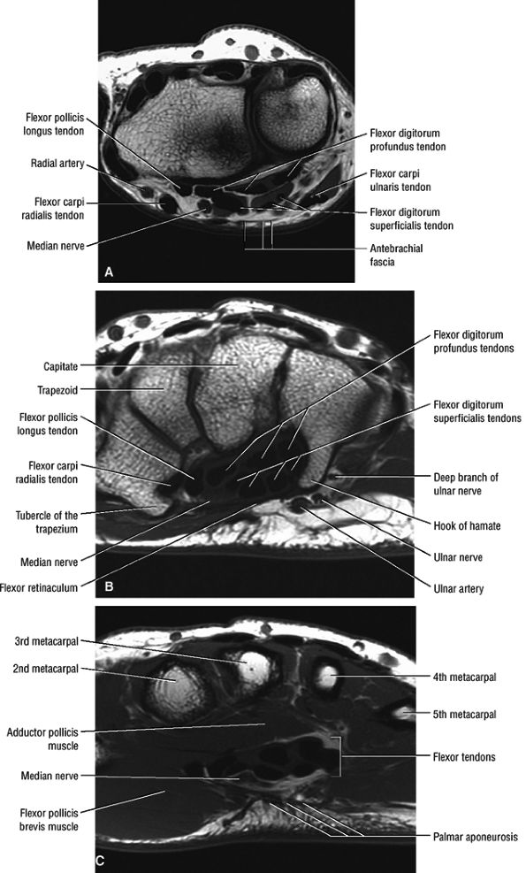 FIGURE 12.37 ● Normal MR anatomy of the median nerve. (A) Axial T1-weighted image at the level of the distal radioulnar joint demonstrates the antebrachial fascia overlying the median nerve. (B) Axial T1-weighted image at the level of the distal carpal tunnel shows the flexor retinaculum extending between the hook of the hamate and the tubercle of the trapezium. (C) Axial T1-weighted image at the level of the proximal metacarpals shows the palmar aponeurosis and the proximal digital branches of the median nerve.
