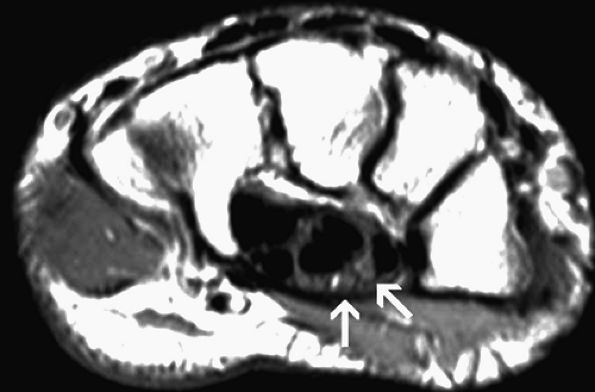 Selective denervation edema and atrophy of the flexor carpi ulnaris and flexor digitorum profundus muscles, best appreciated on axial forearm images, are additional contributory features in the MR diagnosis of ulnar neuropathy (see Fig. 12.20).62