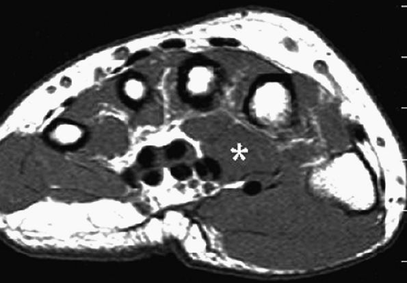 FIGURE 12.40 ● Accessory flexor digitorum superficialis muscle. Axial T1-weighted image shows anomalous muscle (asterisk) deep to the lateral flexor tendons at the level of the metacarpals.