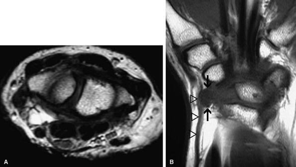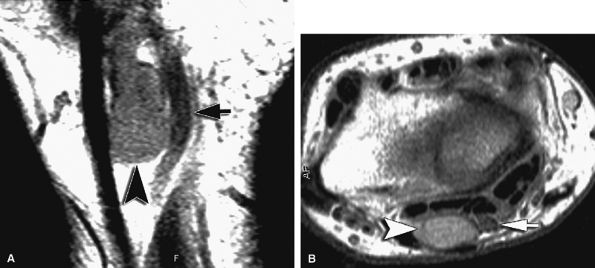 FIGURE 12.44 ● Ganglion cyst. Coronal (A) and axial (B) PD-weighted images show a volar ganglion cyst (arrowheads) displacing the median nerve (arrows).