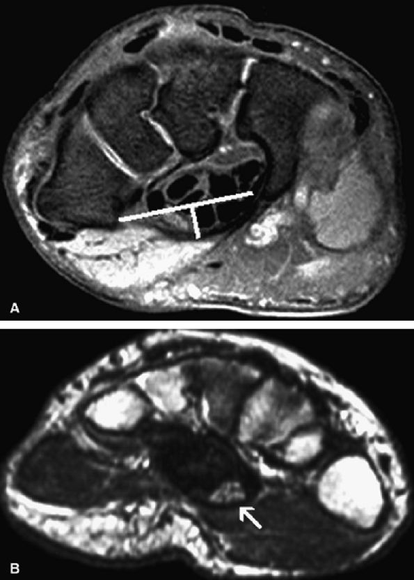 FIGURE 12.45 ● Carpal tunnel syndrome. (A) Axial fat-suppressed T2-weighted image through the distal carpal tunnel demonstrates enlargement of the median nerve with bowing of the flexor retinaculum. The bowing ratio of the flexor retinaculum, determined by dividing its palmar displacement by the distance between the hook of the hamate to the tubercle of the trapezium, was 0.18 (normal ratio, 0 to 0.15). (B) Axial T2-weighted image through the proximal metacarpal region shows a swollen and hyperintense median nerve (arrow).