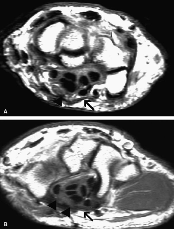 FIGURE 12.46 ● Failed surgical release of the flexor retinaculum. Resection of the flexor retinaculum (arrow) with palmar displacement of the median nerve and flexor tendons is seen at the proximal (A) and distal (B) carpal tunnel. Note the surgical scar effacing the median nerve (arrowheads).