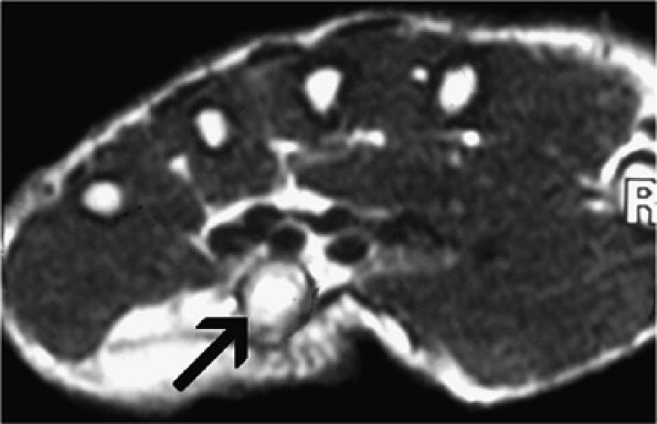 seen as early as 24 hours after complete transection of the sciatic nerve in rats and precede muscle atrophy.9 MR imaging has also been successfully used experimentally as an indicator of nerve healing and re-innervation following transection and repair of the posterior tibial nerve in rats. Changes in T2 relaxation, noted in the first 4 weeks following surgical intervention, completely returned to normal at 6 weeks of follow-up.10