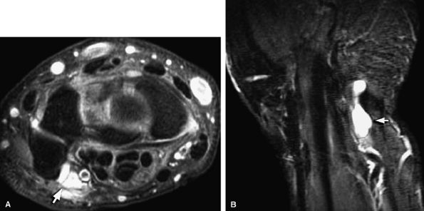 FIGURE 12.49 ● Ganglion cyst compressing the ulnar nerve. Axial (A) and oblique coronal (B) fat-suppressed T2-weighted images demonstrate a ganglion cyst (arrows) within Guyon's canal.
