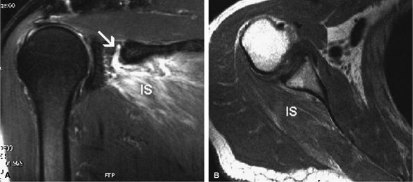 FIGURE 12.6 ● Suprascapular nerve syndrome secondary to a suprascapular varix. Oblique coronal fat-suppressed T2-weighted (A) and axial PD-weighed (B) images demonstrate prominent suprascapular veins (arrow) within the suprascapular incisura and denervation edema of the infraspinatus (IS) muscle.
