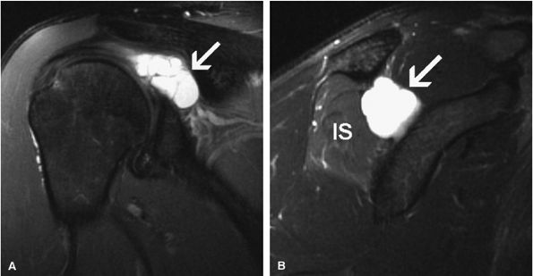 Ganglion cysts at the scapular incisura, typically associated with superior and posterior labral tears (Fig. 12.7)