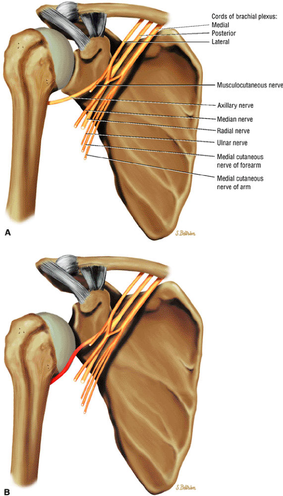 FIGURE 12.8 ● The axillary nerve. (A) The axillary nerve is seen coursing within the quadrilateral space in close relationship to the inferior glenoid rim. (B) Traction on the axillary nerve by a dislocated humeral head.