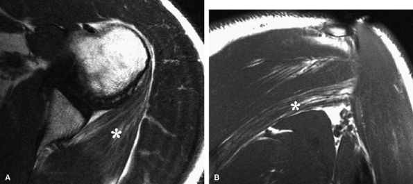 FIGURE 12.9 ● Quadrilateral space syndrome. Axial (A) and oblique coronal (B) PD-weighted images demonstrate selective atrophy and fatty infiltration of the teres minor muscle (asterisk).