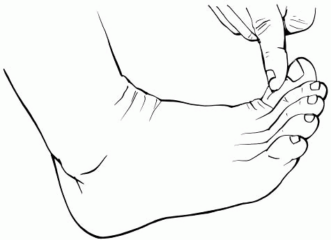 Examination of large toe dorsiflexor (extensor hallucis longus) strength. Ask the patient to lift his or her large toe upward, and then ask him or her to resist you as you attempt to push the toe down. What you might say as you test the strength: “Don’t let me push your toe down.” |