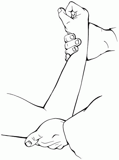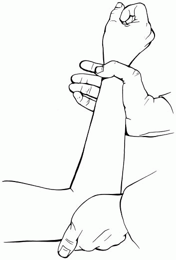 Examination of elbow flexion (brachioradialis) strength. Ask the patient to flex his or her arm at approximately 90 degrees at the elbow, with the patient’s forearm partially pronated so that the radial wrist is facing his or her shoulder, and then ask the patient to resist you as you attempt to extend the arm. What you might say as you test the strength: “Don’t let me pull on your arm.” |