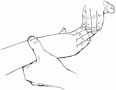 Examination of finger extension (extensor digitorum communis) strength. Ask the patient to lift (extend) his or her fingers, and then ask the patient to resist you as you attempt to push down on the extended fingers. What you might say as you test the strength: “Don’t let me push your fingers down.” |