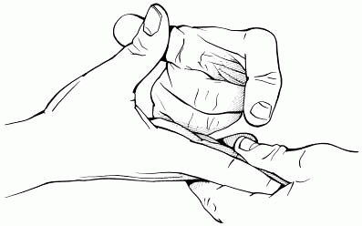 Examination of thumb flexion (flexor pollicis longus) strength. Ask the patient to flex the distal joint of the thumb, and then ask the patient to resist you as you attempt to straighten the thumb. (Similar testing can be done to test the flexor digitorum profundus that flexes the distal phalanx of the fingers.) What you might say as you test the strength: “Don’t let me pull your thumb.” |