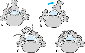 Figure 148.10. Trap-door laminoplasty for extensive stenosis or adjacent-level degeneration. A:
