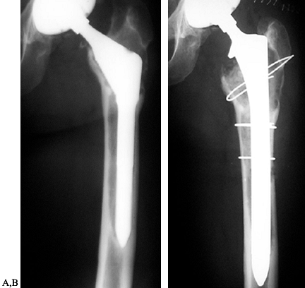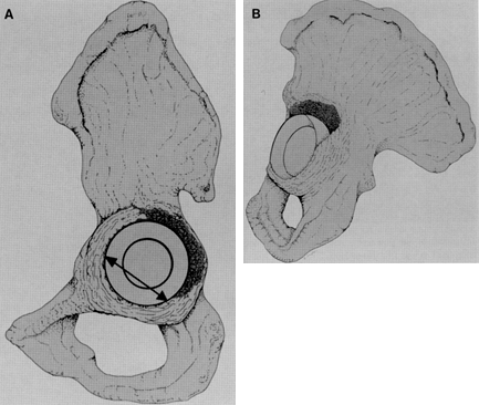 Figure 106.2. A: Focal osteolysis in the supracetabular region. Cup remains stable. B: Linear osteolysis leading to an unstable cup.